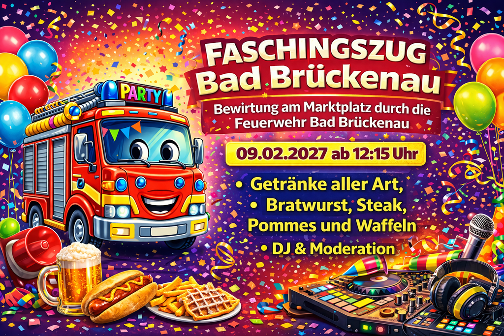 Beim Faschingszug am 09.02.2027 in Bad Brückenau übernimmt die Feuerwehr Bad Brückenau am Marktplatz die Bewirtung. Parallel legt der DJ bereits auf und sorgt für beste Stimmung. Wir sind ab 12 Uhr für euch da. Wir freuen uns auf euren Besuch!